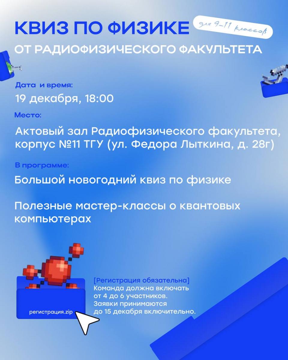 19 декабря в 18:00 радиофизический факультет ТГУ проводит традиционное мероприятие для учеников 9-11 классов – увлекательный квиз по физике.