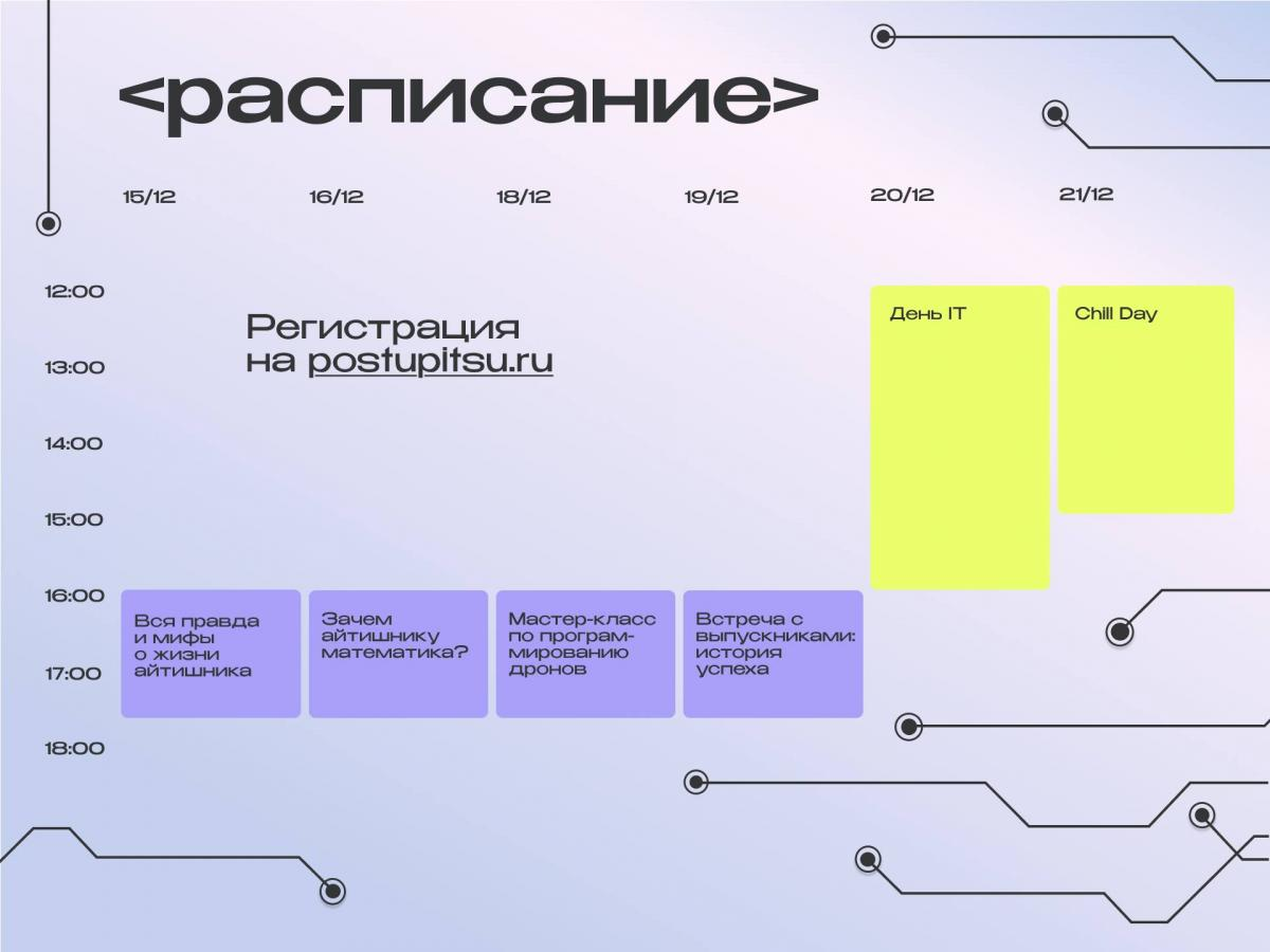 В воскресенье Неделя IT завершится Chill Day — неформальным днём общения со студентами ТГУ. Участников ждут чай с печеньками, просмотр фильма и создание коллажа «Образ будущего», где каждый сможет визуализировать своё профессиональное будущее.
